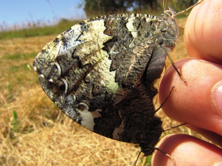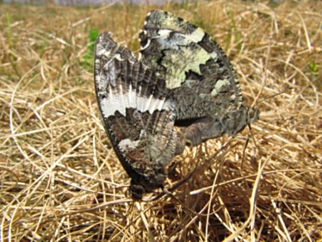 Descripción: es un satírido común. Sus alas son de colores apagados; negras con una franja de manchas blancas en la cara dorsal que vemos en la imagen superior, y crípticas en la cara ventral para camuflarse sobre la corteza de los árboles cuando se posa en ellos con las alas plegadas.